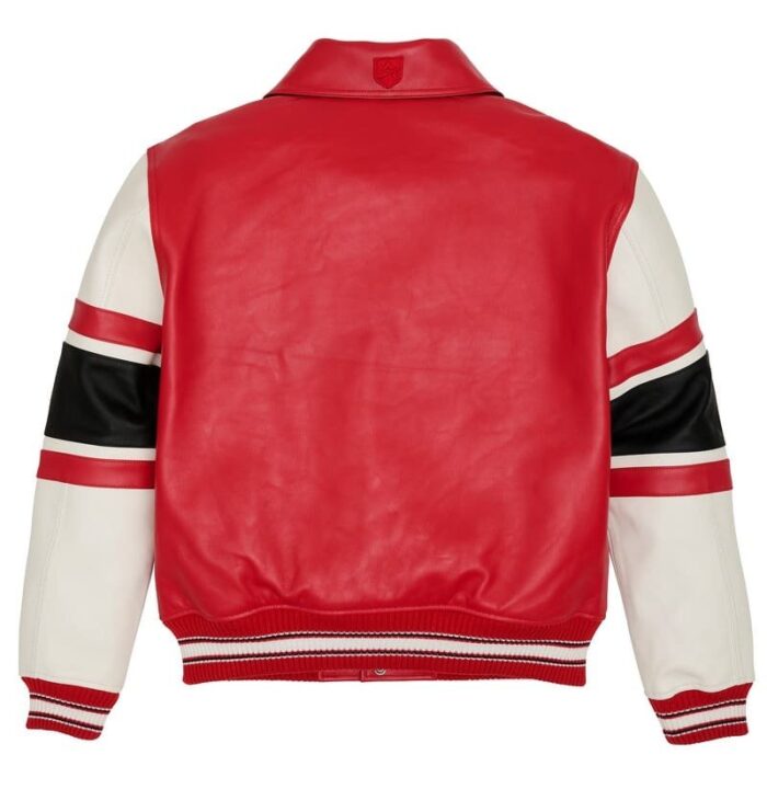 Avirex legend leather jacket red in 100% antique European lamb leather with Avirex goaler art patch set and applique lining art. Wide stripe detailing on sleeves.