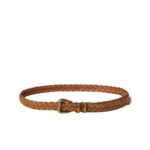 The belt is finished with a polished metal tip, which adds a refined touch of sophistication. The metal tip is sleek and understated, complementing the belt’s braided structure without overpowering it. This thoughtful detail ensures that the belt remains stylish and versatile, suitable for a variety of occasions.