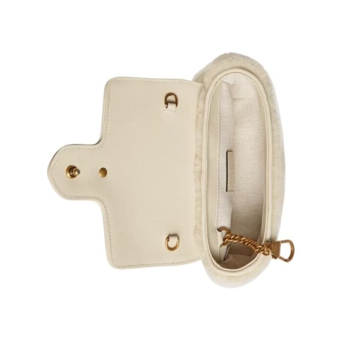 The standout feature of the GG Marmont Super Mini Bag is the signature Double G hardware, a nod to the brand’s founder, Guccio Gucci. This emblem, rendered in antiqued gold-tone metal, serves as both a closure and a statement piece, instantly recognizable and synonymous with Gucci’s enduring allure. GUCCI GG MARMONT SUPER MINI BAG