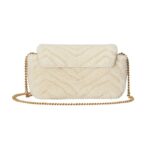 The versatility of the GG Marmont Super Mini Bag is enhanced by its adjustable chain strap, which can be worn in multiple ways. Whether draped over the shoulder, worn crossbody, or carried as a clutch by tucking in the chain, this bag adapts effortlessly to different occasions and styles. The chain, crafted from the same antiqued gold-tone metal as the GG logo, adds a touch of opulence and complements the bag’s overall aesthetic. GUCCI GG MARMONT SUPER MINI BAG