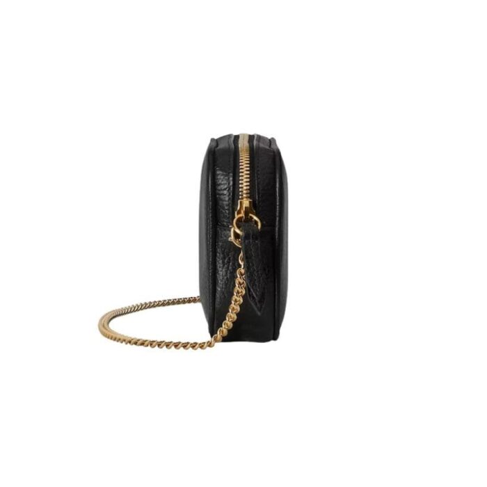 A defining feature of the GG Marmont Super Mini is the antique gold-toned hardware, particularly the iconic GG logo on the front flap. This emblematic detail is a nod to Gucci’s rich heritage and adds a touch of vintage glamour to the design. The chain shoulder strap, also in antique gold, complements the hardware and allows for versatile styling options. It can be worn as a crossbody, over the shoulder, or even used as a clutch by tucking the chain inside.