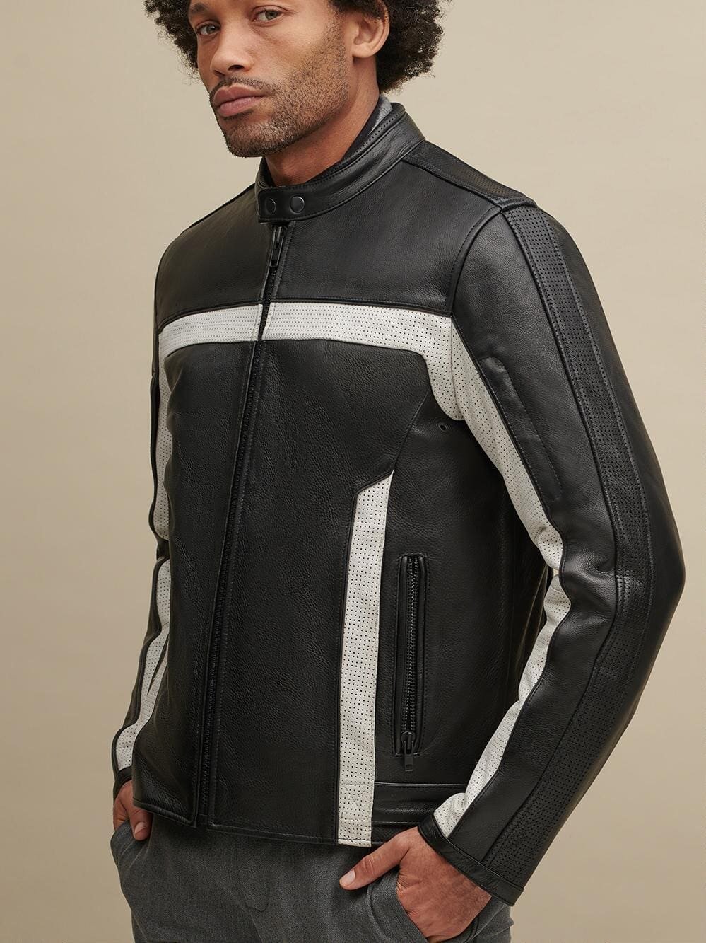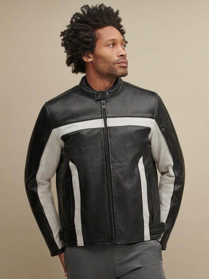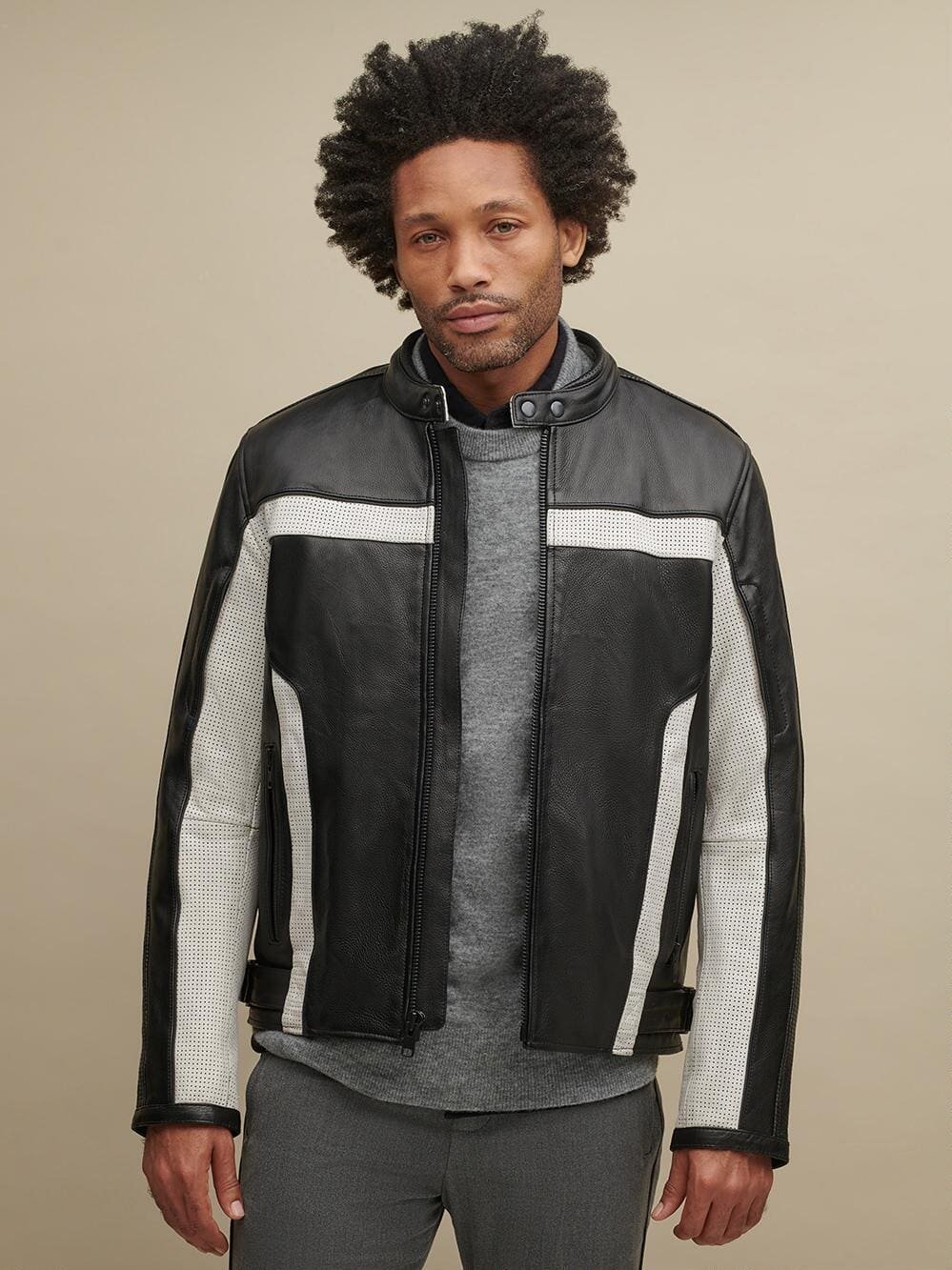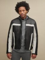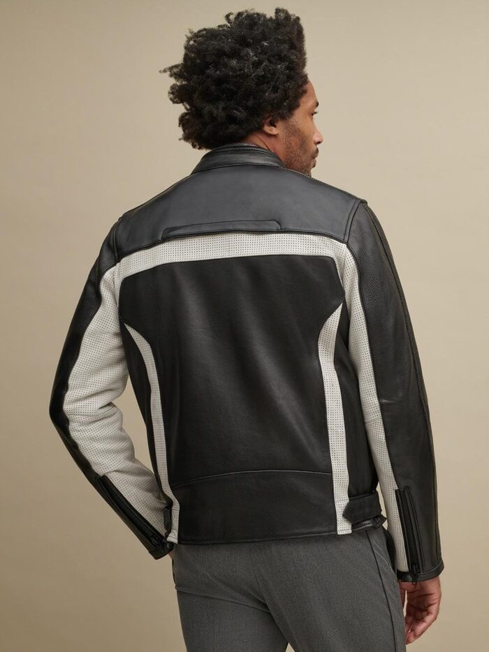 Contrast color blocked leather biker jacket.