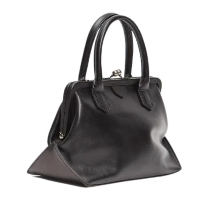Introducing the La Garconne Y’s Clasp Closure Bag black structured bag, featuring top handles crafted from semi-glossed leather.