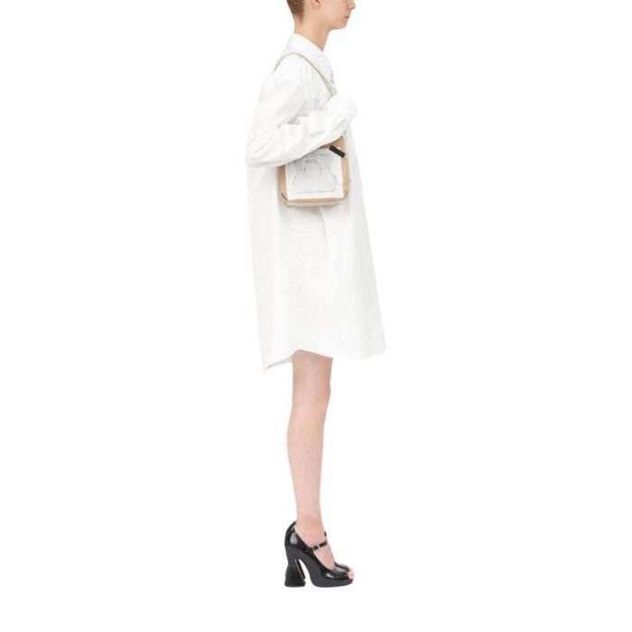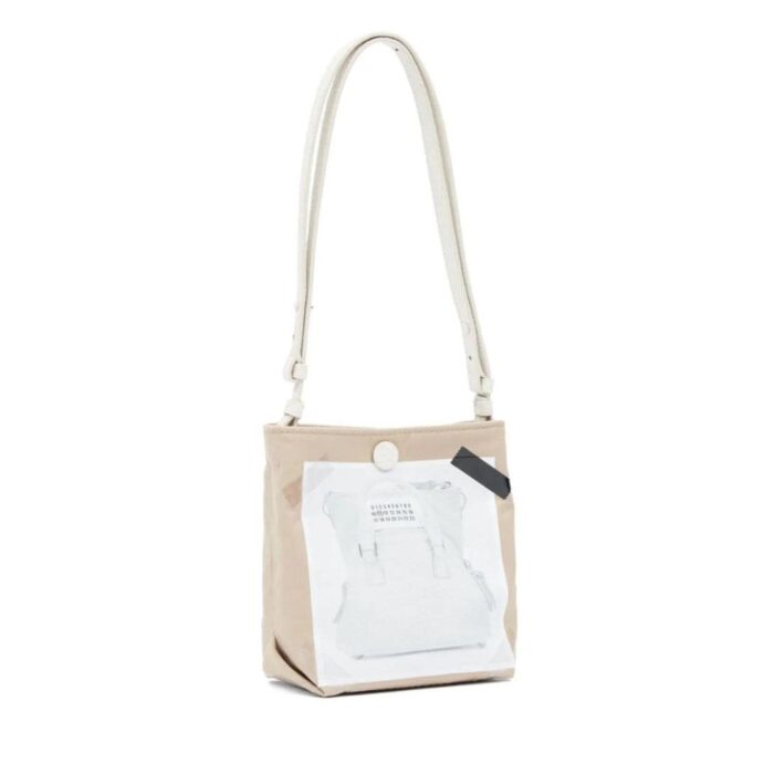 The bag is adorned with intricate appliqué detail and features a trompe l’oeil print, adding a playful yet artistic touch to its design. Maison Margiela’s signature numbers motif further enhances the bag’s allure, showcasing the brand’s iconic aesthetic.