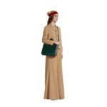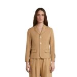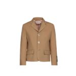 The jacket features a tailored silhouette with a structured shoulder and a slightly nipped-in waist, creating a flattering shape that complements a variety of body types. Its single-breasted design is punctuated by a row of sleek, contrasting buttons that add a touch of modern sophistication. The contrast stitching is the standout detail, accentuating the jacket’s clean lines and enhancing its overall visual interest. This stitching runs along the lapels, pockets, and cuffs, creating a striking juxtaposition against the soft beige wool.