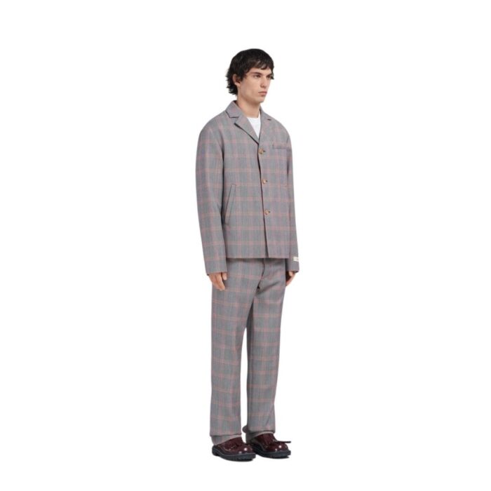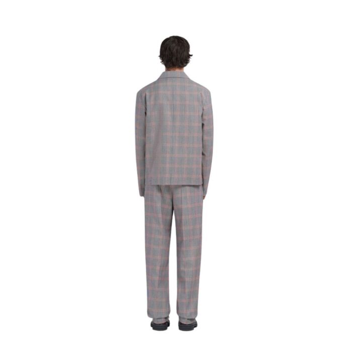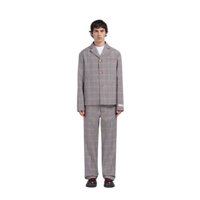 The Marni Orange Checked Tech Wool Blazer also includes functional elements such as two flap pockets and a chest pocket, adding practicality to its stylish design. The interior is lined with a smooth fabric that ensures ease of movement and additional comfort. A subtle touch of Marni branding on the inside completes the ensemble, affirming its premium quality.