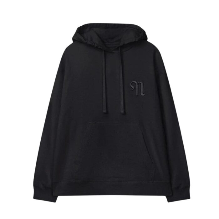 The Ever hoodie, draped in a versatile black hue, exudes timeless sophistication and effortless elegance. This iconic colour choice serves as a canvas for Nanushka’s embroidered monogram, delicately placed across the chest. The monogram, a subtle yet distinctive detail, adds a touch of refinement to the hoodie while showcasing the brand’s signature aesthetic and attention to detail.
