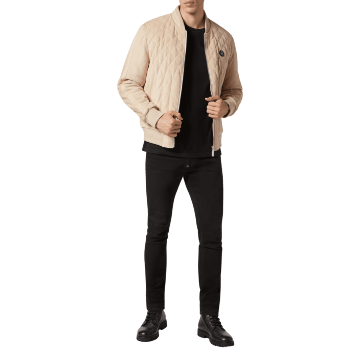 Philipp Plein Suede Bomber Jacket outside shell: 100% lamb leather | Lining: 100% polyester | Rib-knit: 98% polyester, 2% elastane | Filling: 100% polyester. The model is 188cm/6’2″ and wearing size M. Philipp Plein ensures authenticity through superior raw materials and expert craftsmanship in all products available on the official online store.