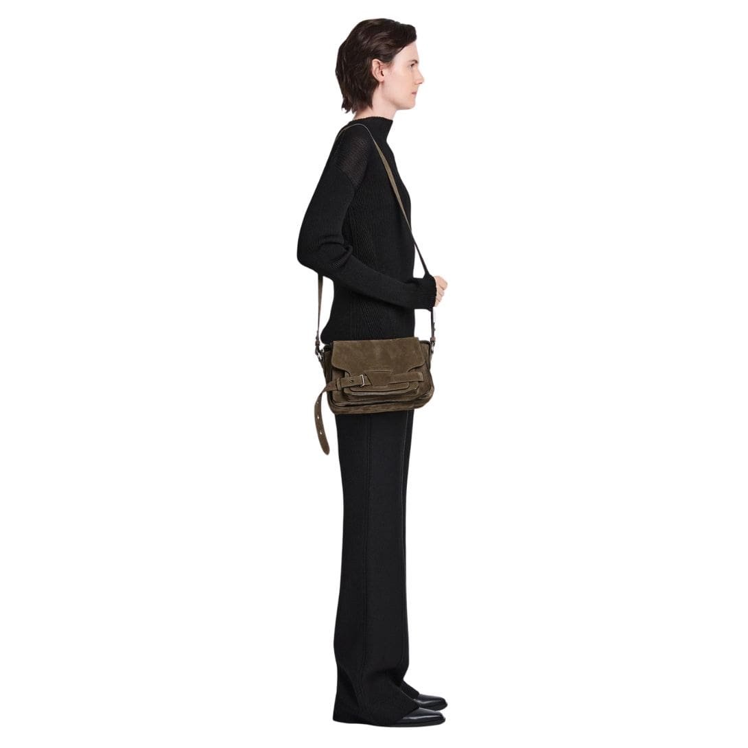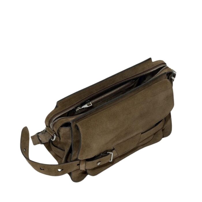 At the forefront of the design are the signature belted straps adorned with a distinguished D-ring buckle, securing the fold-over flap with both practicality and style. Drawing inspiration from the functional yet stylish elements of workwear satchels, these straps add a touch of rugged elegance to the bag while ensuring the safety and security of your belongings.
