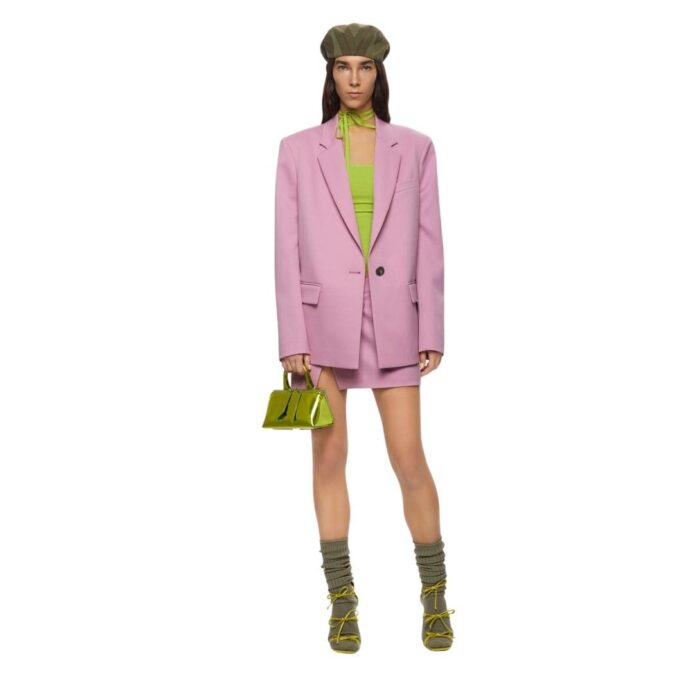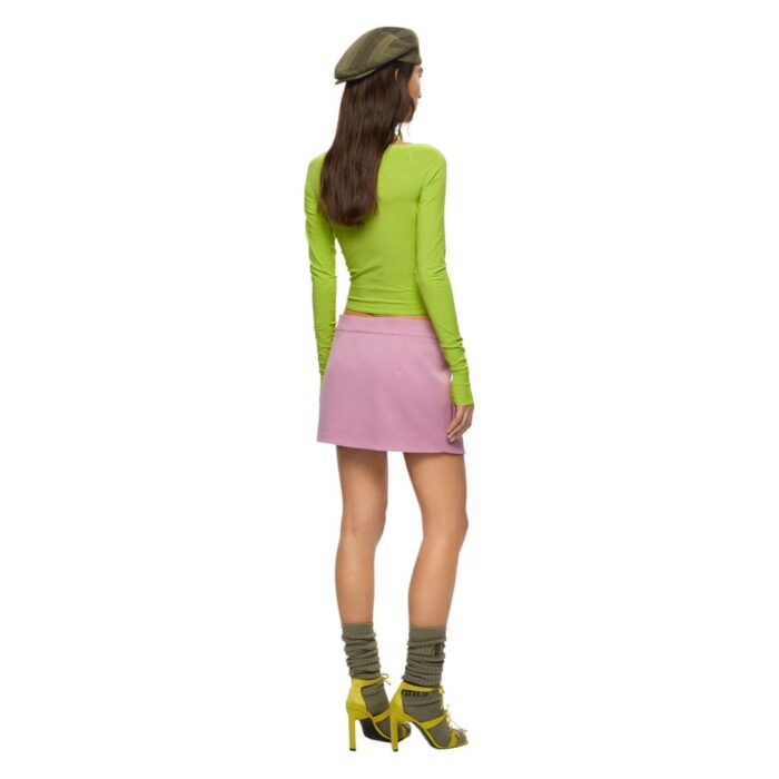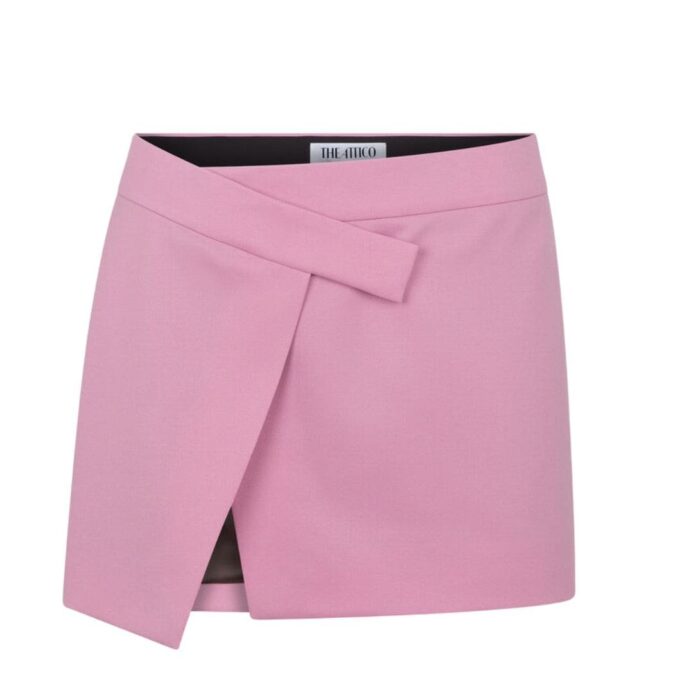The attico cloe orchid haze mini skirt in orchid haze cool gabardine stretch is complemented by a chocolate jacquard logo lining, showcasing a blend of style and sophistication. Made in Italy.