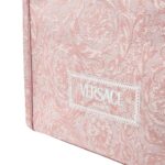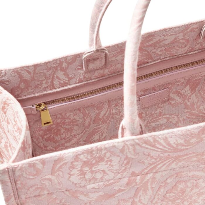 The exterior of the tote is adorned with Versace’s signature Barocco motif, a tribute to the brand’s rich heritage and timeless aesthetic. Intricately designed, the Barocco pattern consists of swirling motifs inspired by classical Greek and Roman art, creating a mesmerizing visual impact. The lavish gold-tone hardware adds a touch of glamour, elevating the bag to an iconic status.